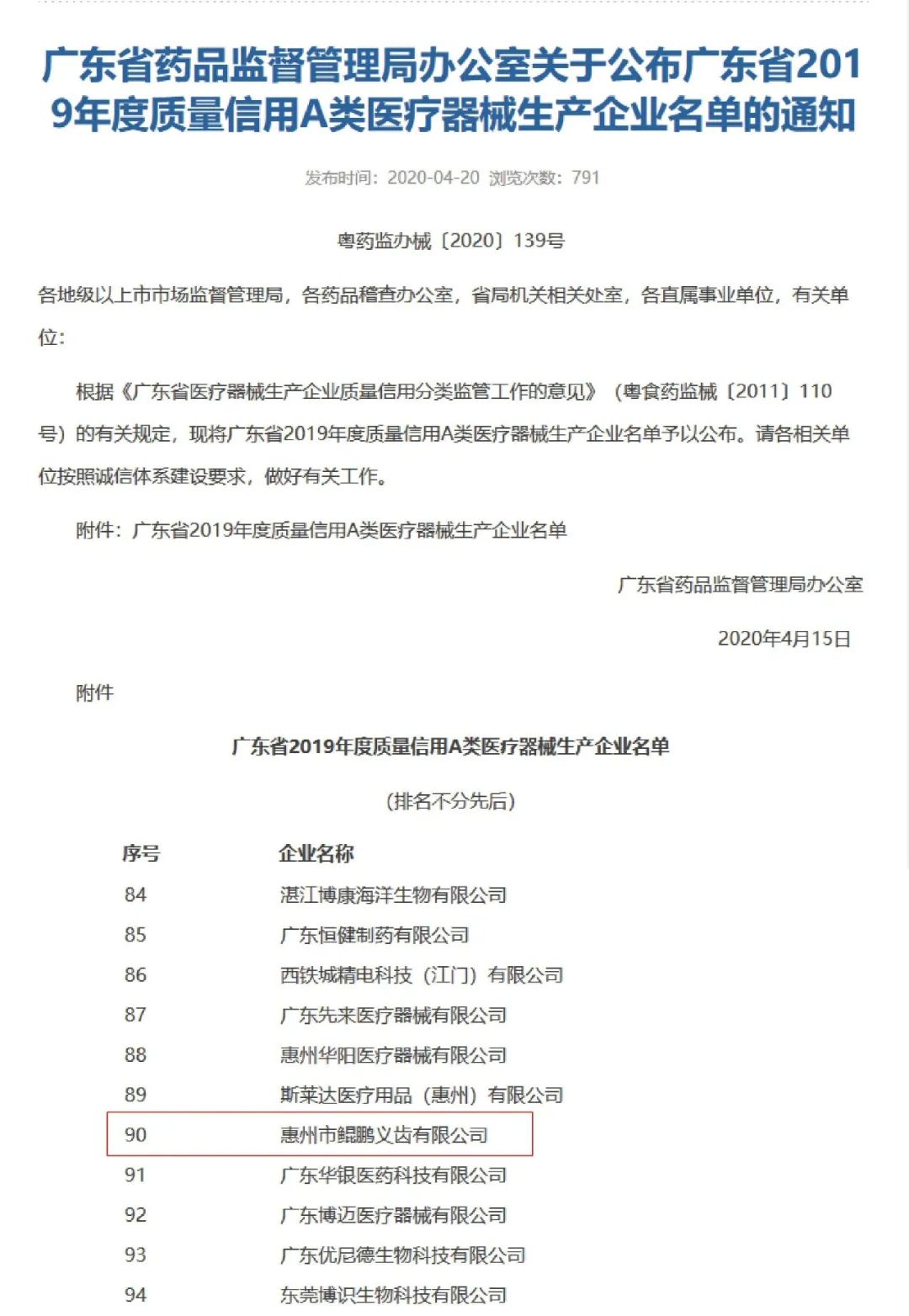 近期廣東省藥監(jiān)局公布了廣東省2019年度質(zhì)量信用A類醫(yī)療器械生產(chǎn)企業(yè)名單,惠州市鯤鵬義齒連續(xù)多年再次入榜。